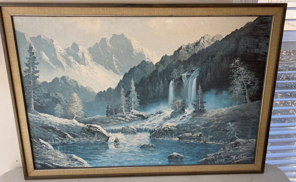Whitman Print of Mountain Water Fall, framed, 27"h., 39"w, Location Back Office Whitman Print of Mountain Water Fall, framed, 27"h., 39"w, Location Back Office