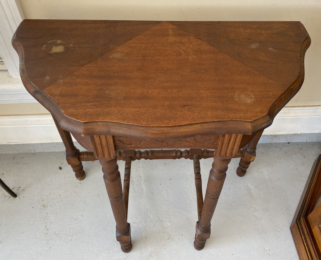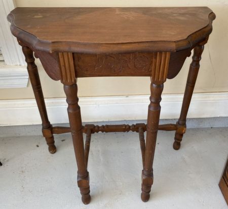 Depression Era Demilune Wall Table, carved front, light wear spots on top. 24"h. 23"w. Location Left Conference Room Depression Era Demilune Wall Table, carved front, light wear spots on top. 24"h. 23"w. Location Left Conference Room