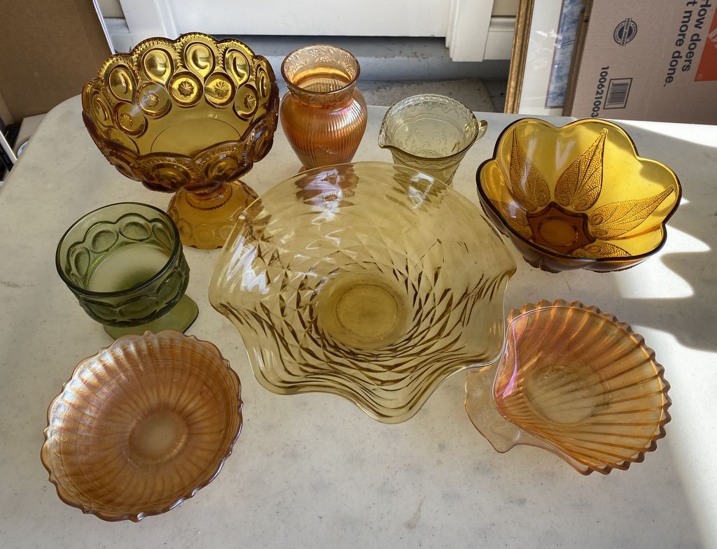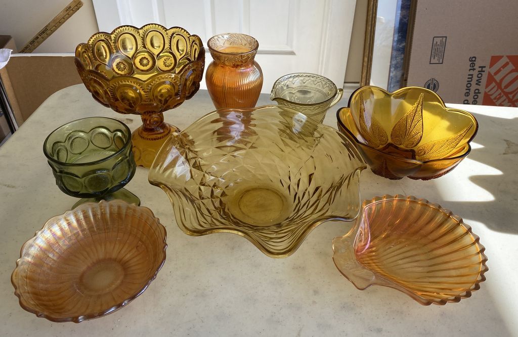 Group of Vintage Amber and Green Depression Style Glassware, Location Room by Kitchen Group of Vintage Amber and Green Depression Style Glassware, Location Room by Kitchen