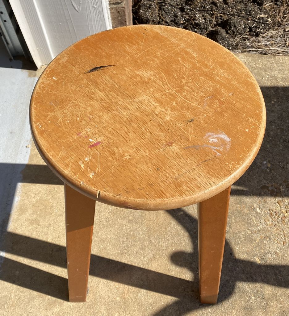 Small Wood Stool, usage wear on finish, 18"h., Location Back Office Small Wood Stool, usage wear on finish, 18"h., Location Back Office