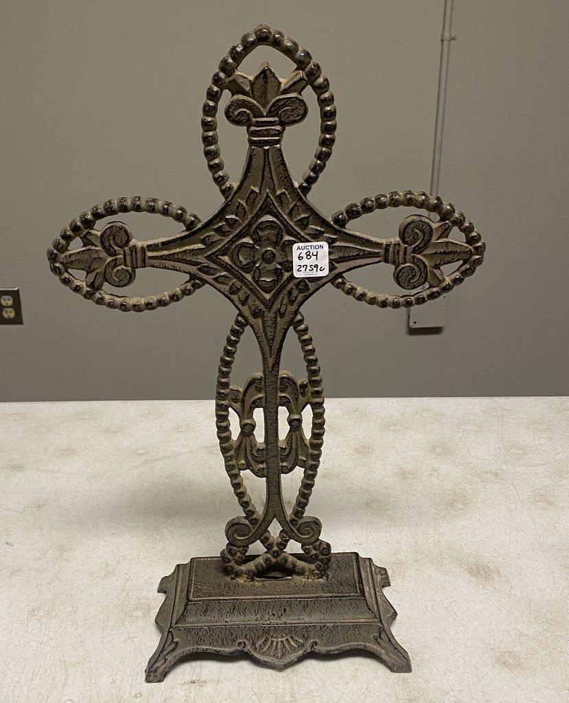 Tall Bronze Metal Decorative Cross, 19.5" h. 12.5" w. Location Back Cart Tall Bronze Metal Decorative Cross, 19.5" h. 12.5" w. Location Back Cart