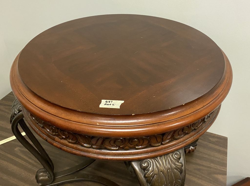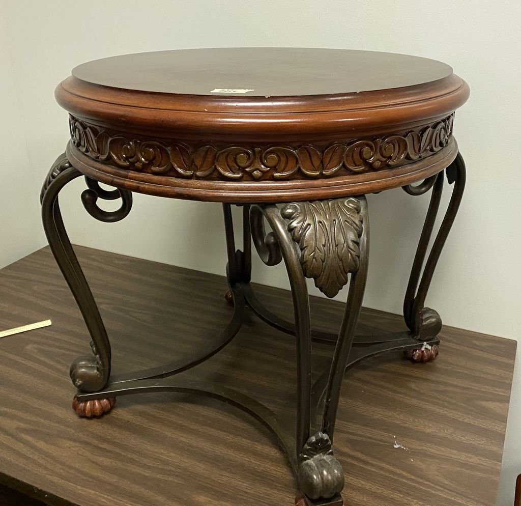 Modern Cherry Round Lamp Table, metal base, wood top, 25"h., 26"dia. Location Left Conference Room Modern Cherry Round Lamp Table, metal base, wood top, 25"h., 26"dia. Location Left Conference Room