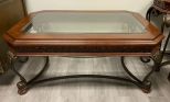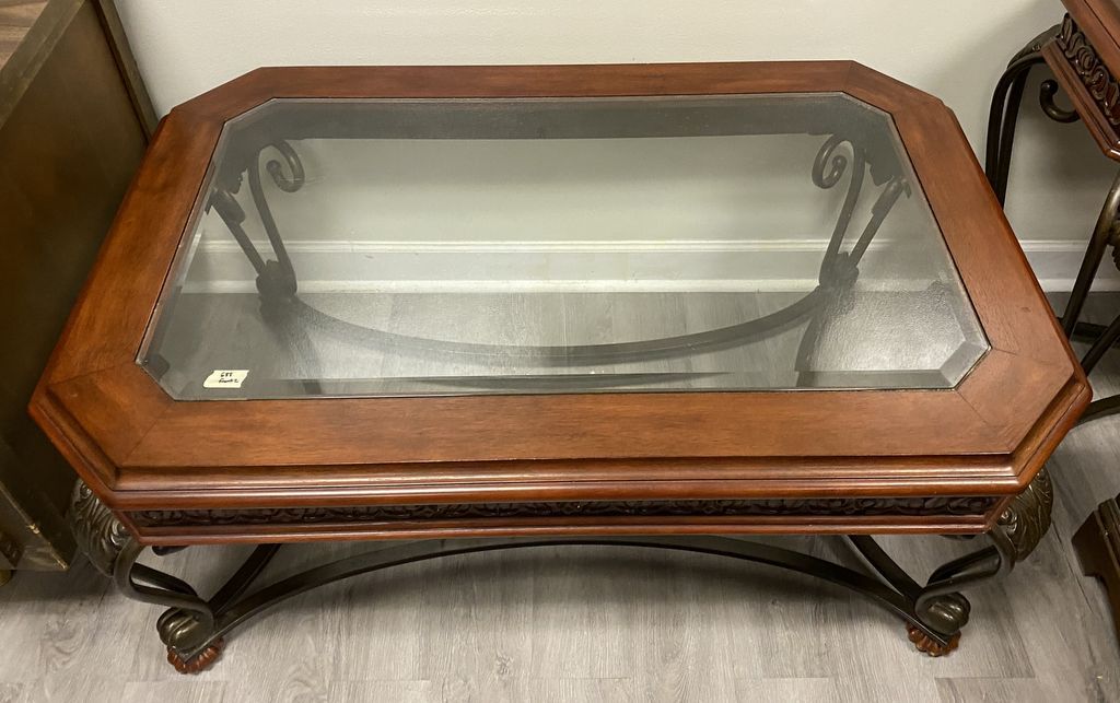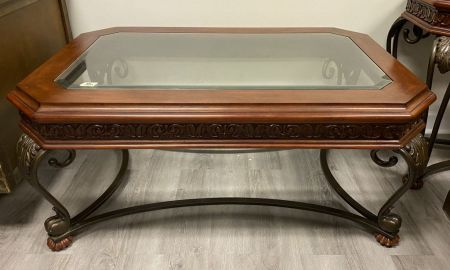 Modern Cherry Glass Top Coffee Table, metal base, wood and glass top, 20"h., 48"w. Location Left Conference Room Modern Cherry Glass Top Coffee Table, metal base, wood and glass top, 20"h., 48"w. Location Left Conference Room