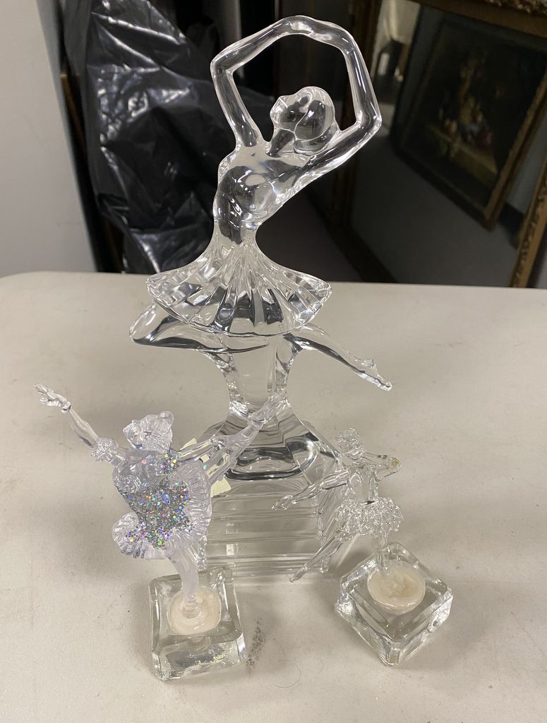 Glass and Plastic Ballerina Figurines, glass one is 11"h. Location Back Bookcases Glass and Plastic Ballerina Figurines, glass one is 11"h. Location Back Bookcases