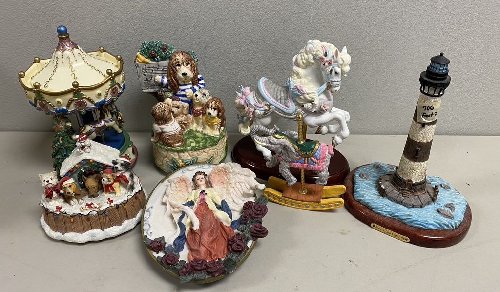 Carousel Horse and Elephant, Dogs, Angel plaque, and Light House figurine. Location Back Left Office Carousel Horse and Elephant, Dogs, Angel plaque, and Light House figurine. Location Back Left Office