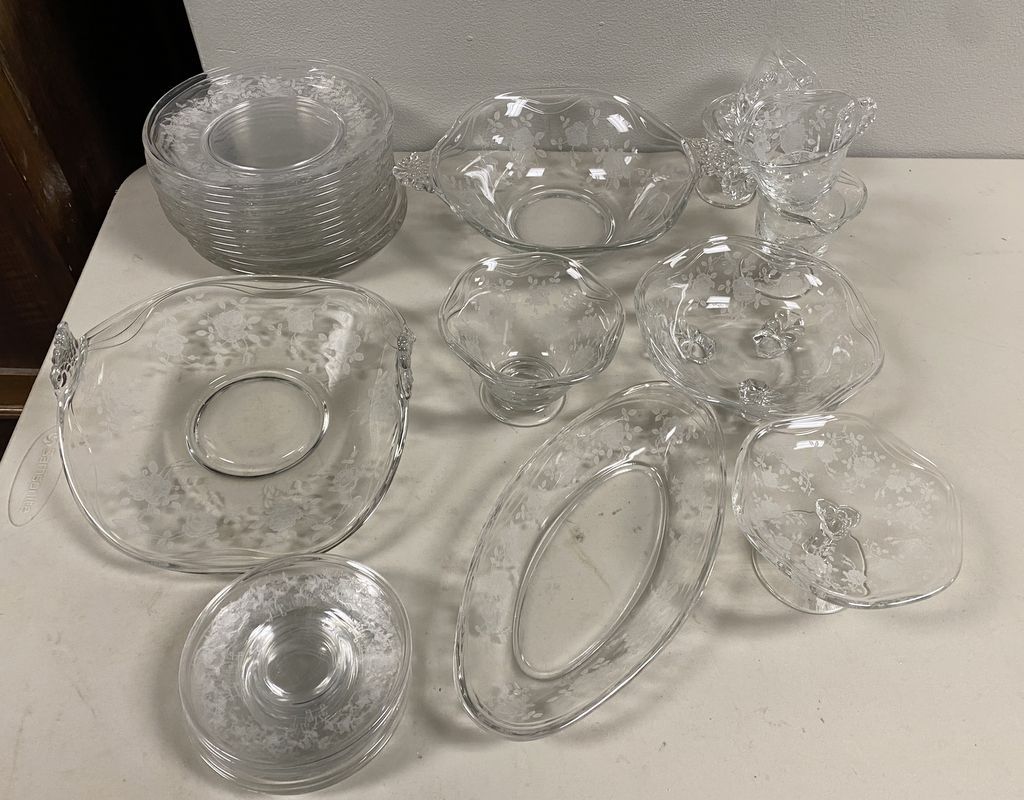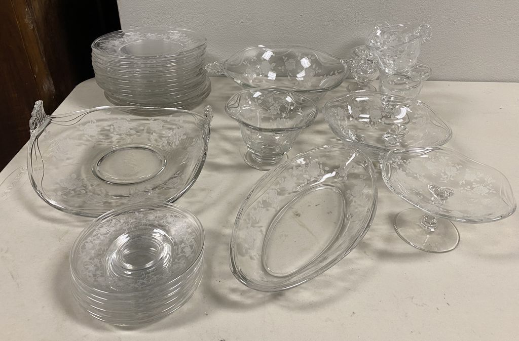 Group of Etched Flower Glassware, salad plates, saucers, cups, compote, dish, bowls. Location Back Offce Group of Etched Flower Glassware, salad plates, saucers, cups, compote, dish, bowls. Location Back Offce
