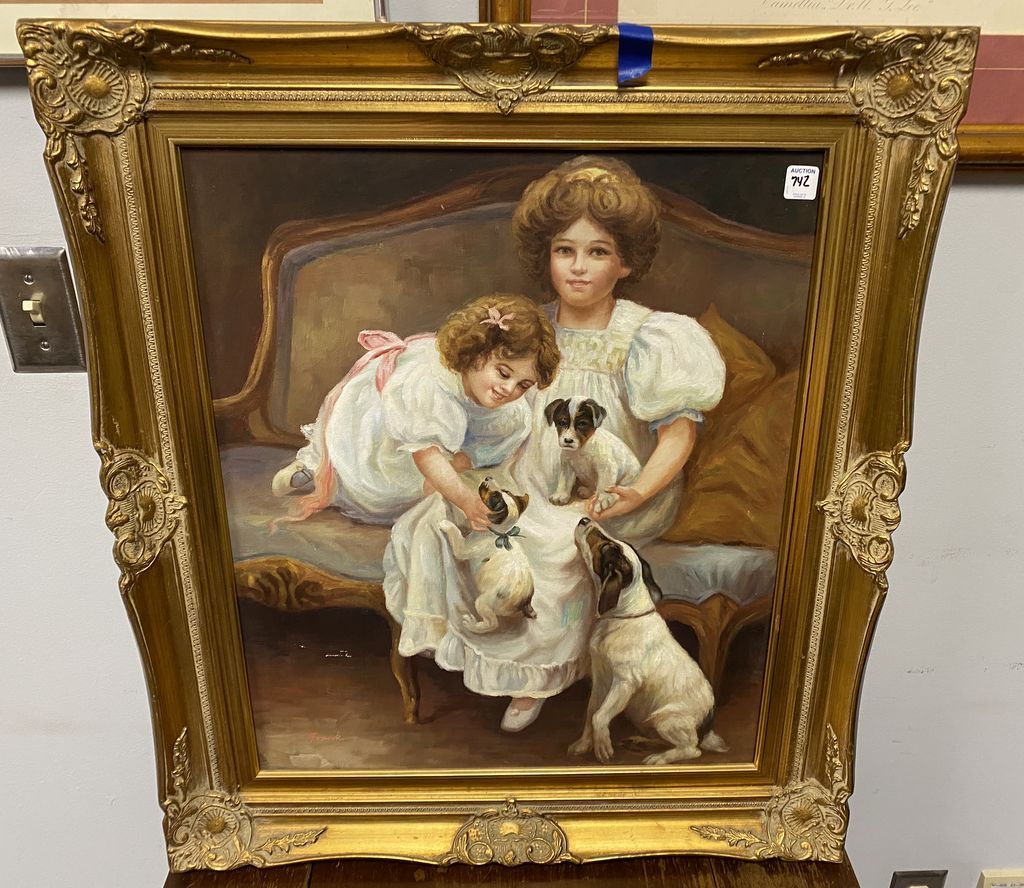 Portrait Painting of Mother, Daughter, and Dogs, on canvas, gold gilt framed, signed Frank, 31"h., 27'w., Location Left Hall Portrait Painting of Mother, Daughter, and Dogs, on canvas, gold gilt framed, signed Frank, 31"h., 27'w., Location Left Hall