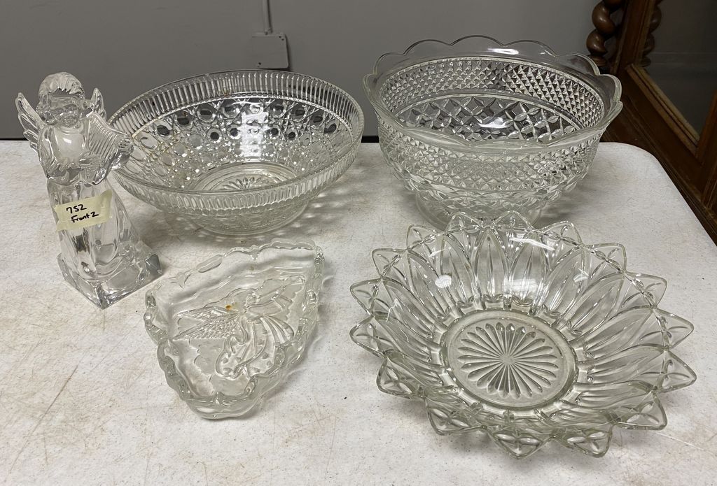 4 Press Glass Bowls and Glass Angel, Location: Room By Kitchen 4 Press Glass Bowls and Glass Angel, Location: Room By Kitchen