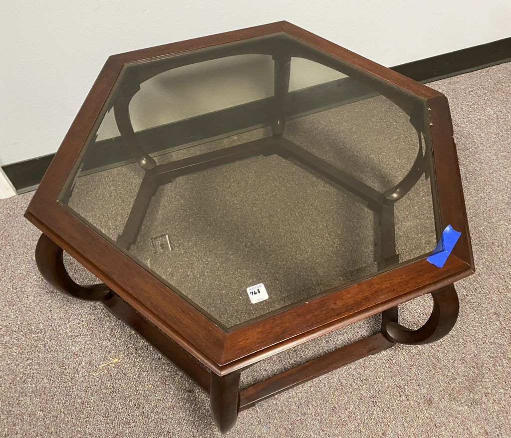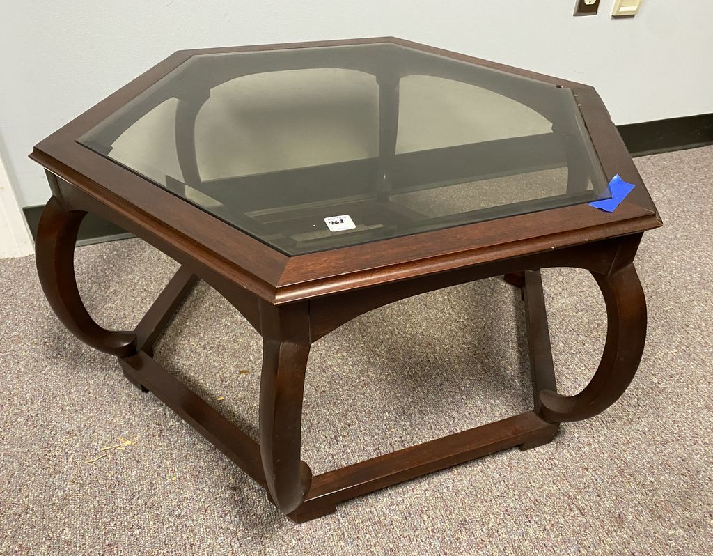 Cherry Octagon Asian Style Coffee Table, Beveled Glass Top, good condition, small nicks, 15"h. 32"w. Location Left Conference Room Cherry Octagon Asian Style Coffee Table, Beveled Glass Top, good condition, small nicks, 15"h. 32"w. Location Left Conference Room