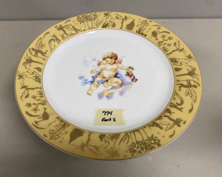 Sorelle Porcelain Cake Stand, Cherub imagery, 5"h. 10"dia. Location Back Left Office Sorelle Porcelain Cake Stand, Cherub imagery, 5"h. 10"dia. Location Back Left Office