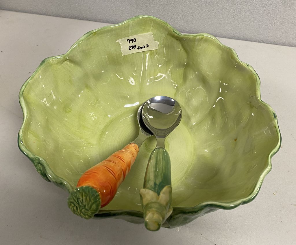 Valeria Ceramic Leaf Salad Bowl, green, with serving spoons. Location Back Left Office Valeria Ceramic Leaf Salad Bowl, green, with serving spoons. Location Back Left Office
