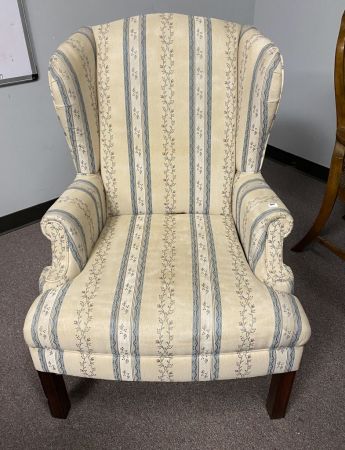 Upholstered Wing Back Arm Chair, Chippendale frame, needs cleaning. Upholstered Wing Back Arm Chair, Chippendale frame, needs cleaning.