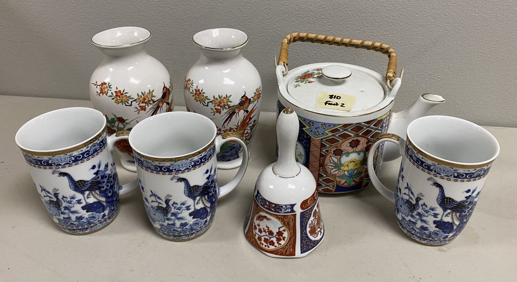 810 Japanese Porcelain Tea Pot, Vases, Bell, and Mugs