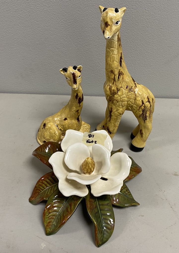 Pottery Giraffe hand painted figurines, 12"h., and Ceramic Magnolia. Location Back Left Office Pottery Giraffe hand painted figurines, 12"h., and Ceramic Magnolia. Location Back Left Office