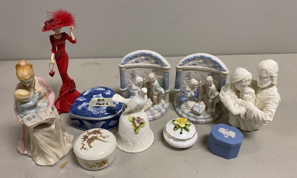 Two Collectable figurines, trinket boxes, Nativity porcelain. Location Back Left Office Two Collectable figurines, trinket boxes, Nativity porcelain. Location Back Left Office