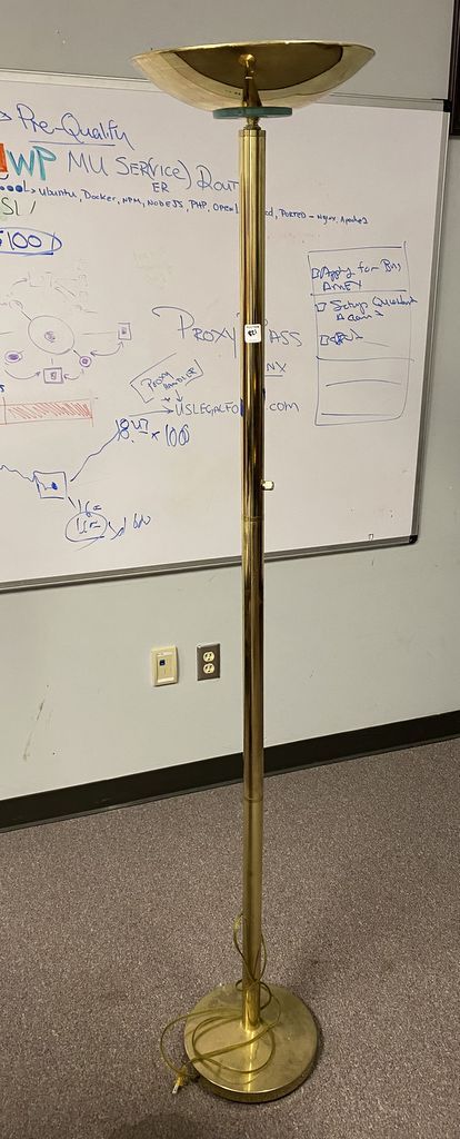 Mid Century Style Brass torchiere Floor Lamp, needs work, 71"h. Location Left Office Mid Century Style Brass torchiere Floor Lamp, needs work, 71"h. Location Left Office