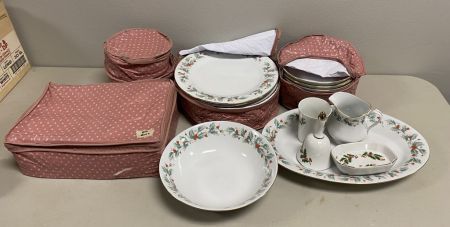 China Pearl "Noel" China Set, cups, dinner plates, bowls, salad plates, dessert plates, bell, creamer, dish. Location Back Left Office China Pearl "Noel" China Set, cups, dinner plates, bowls, salad plates, dessert plates, bell, creamer, dish. Location Back Left Office