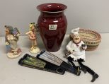 877 Red Vase, Resin Old Lady Figurines, Chef, Straw Basket, and Chinese Fans