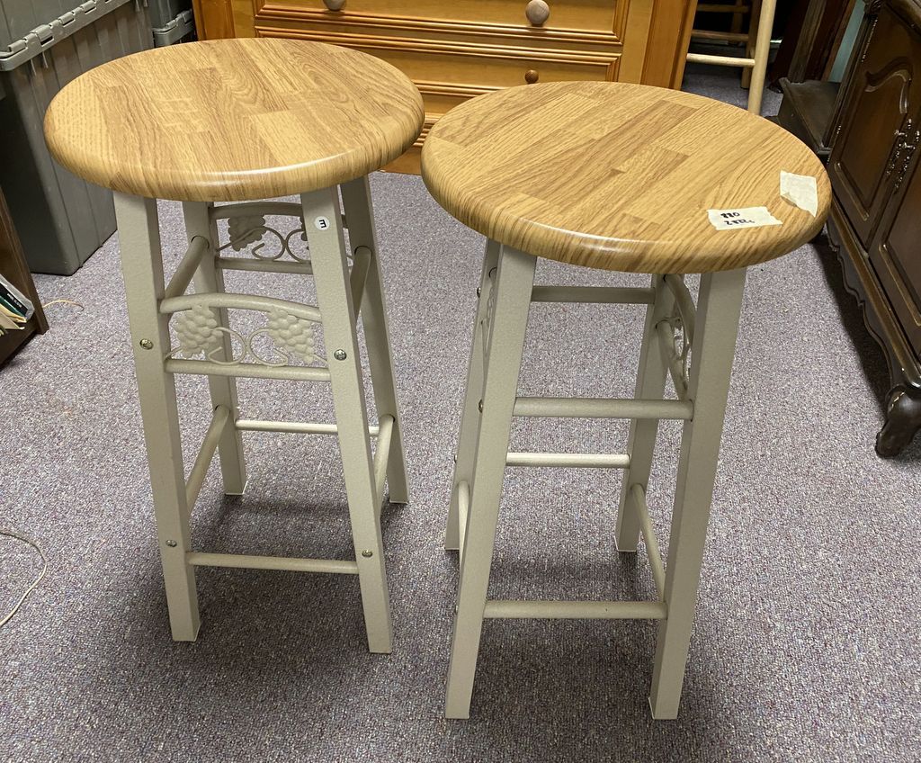 Pair of Metal Base Bar Stools, top needs tightening, 24"h., 12"dia. Location Right Office Pair of Metal Base Bar Stools, top needs tightening, 24"h., 12"dia. Location Right Office