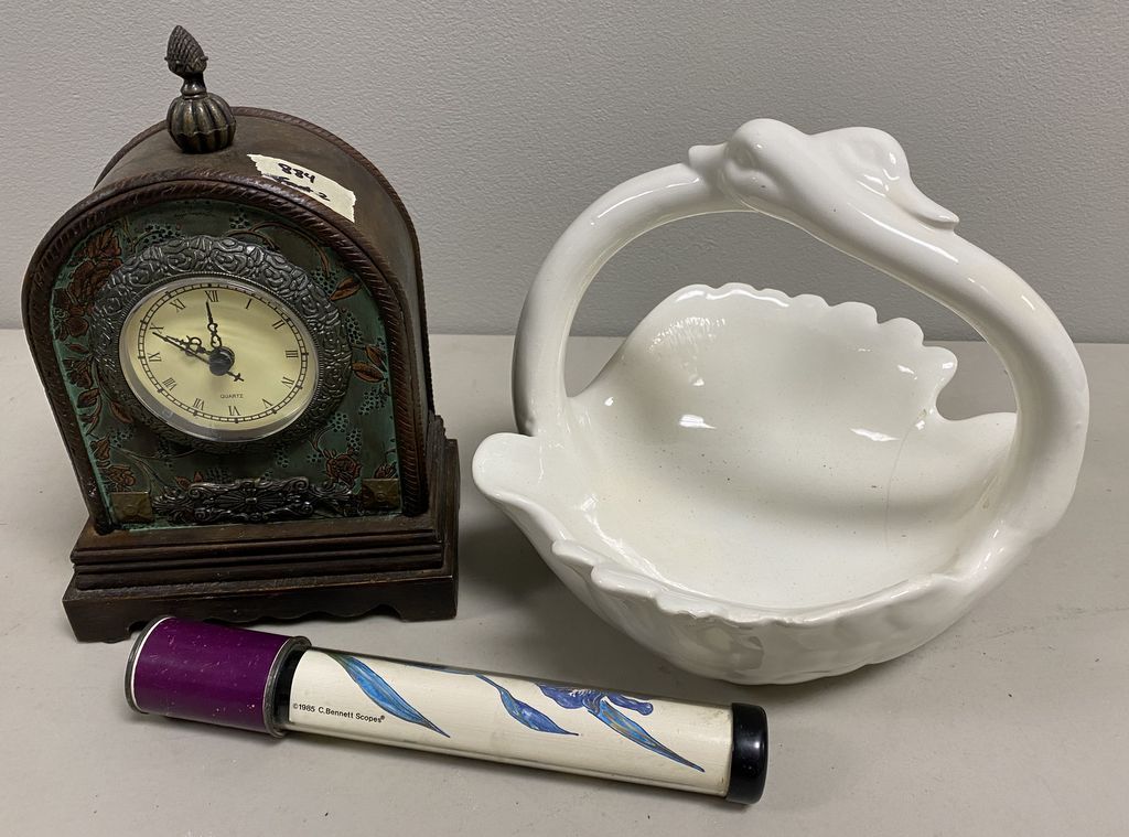 884 Swan Porcelain Basket, Battery Operated Clock and C. Bennet Scopes