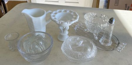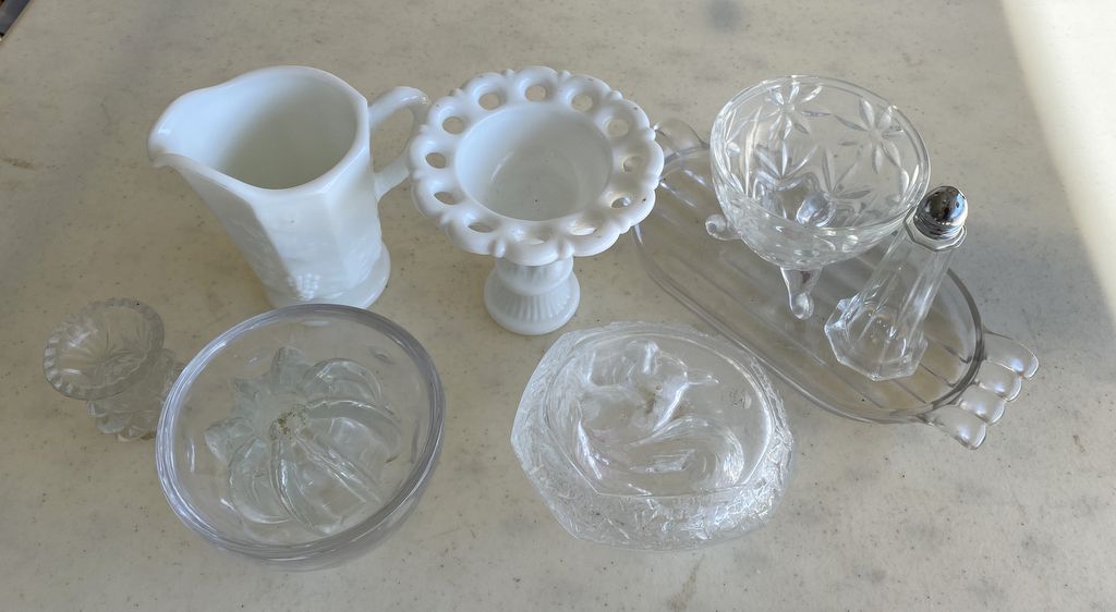 Milk Glass and Clear Glass Pieces, Location Room by Kitchen Milk Glass and Clear Glass Pieces, Location Room by Kitchen