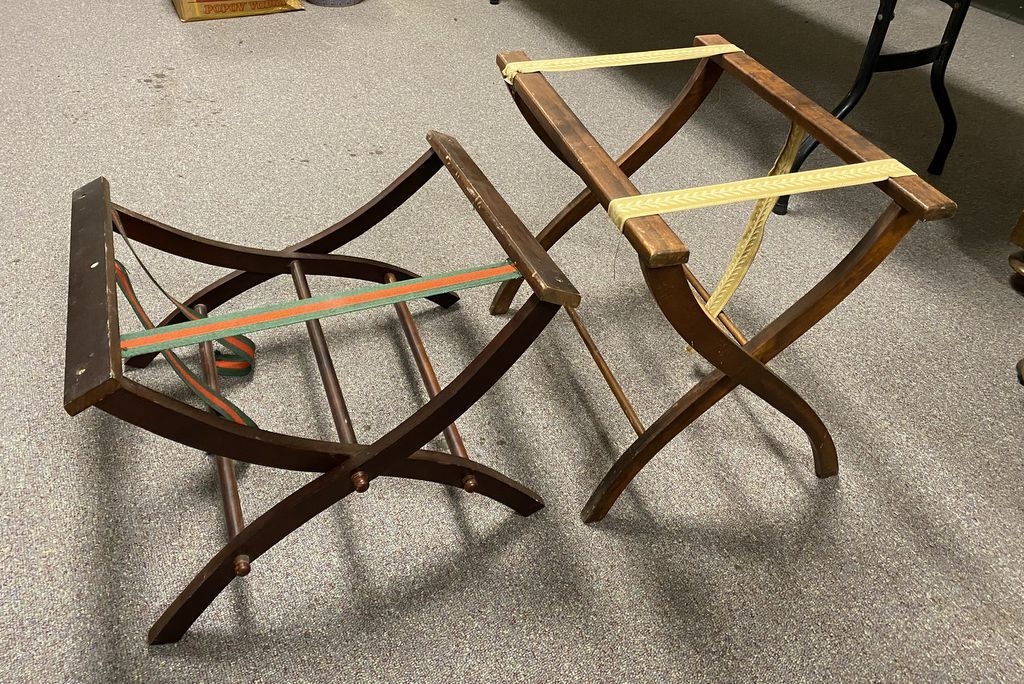 Two Vintage Luggage Racks, one with damaged straps, Location Back Right Office Two Vintage Luggage Racks, one with damaged straps, Location Back Right Office