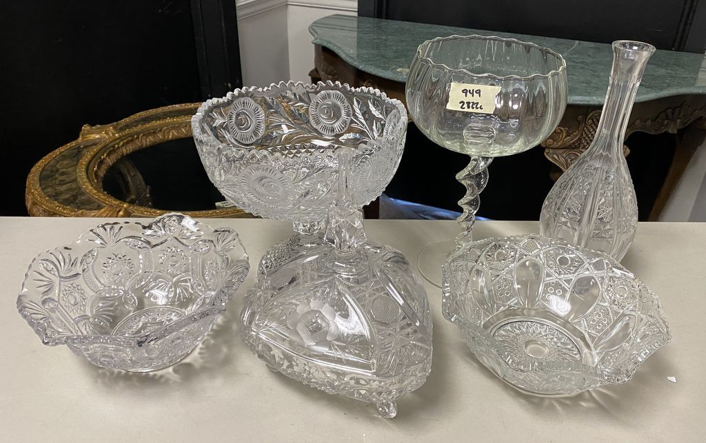 Group of Pressed Crystal Compotes, Candy Dish, Decanter, and Bowls, Location Right Cubby Group of Pressed Crystal Compotes, Candy Dish, Decanter, and Bowls, Location Right Cubby