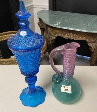 Blue Glass Compote 16"h and Hand Blown Pitcher, Location Right Hubby Blue Glass Compote 16"h and Hand Blown Pitcher, Location Right Hubby