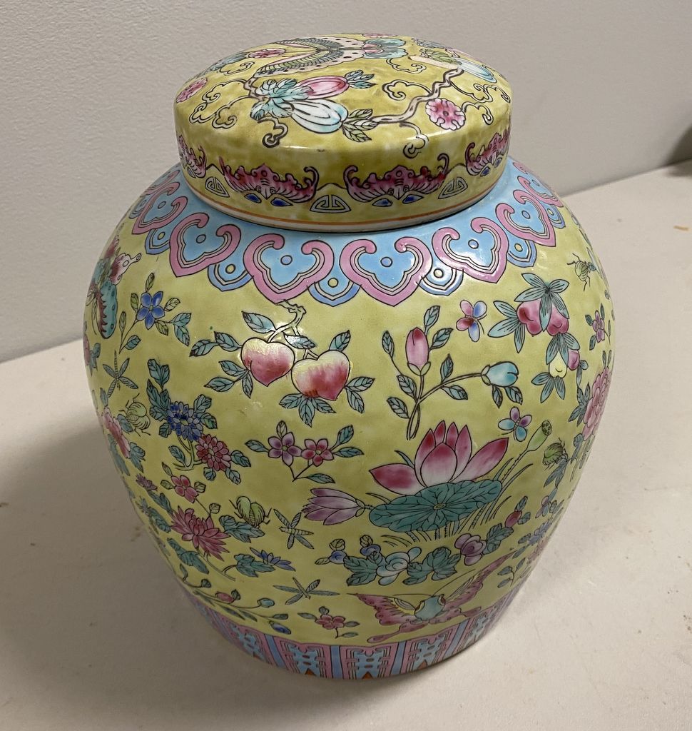 Asian Porcelain Ginger Jar, with lid, modern, 11"h., Location Right Back Office Asian Porcelain Ginger Jar, with lid, modern, 11"h., Location Right Back Office