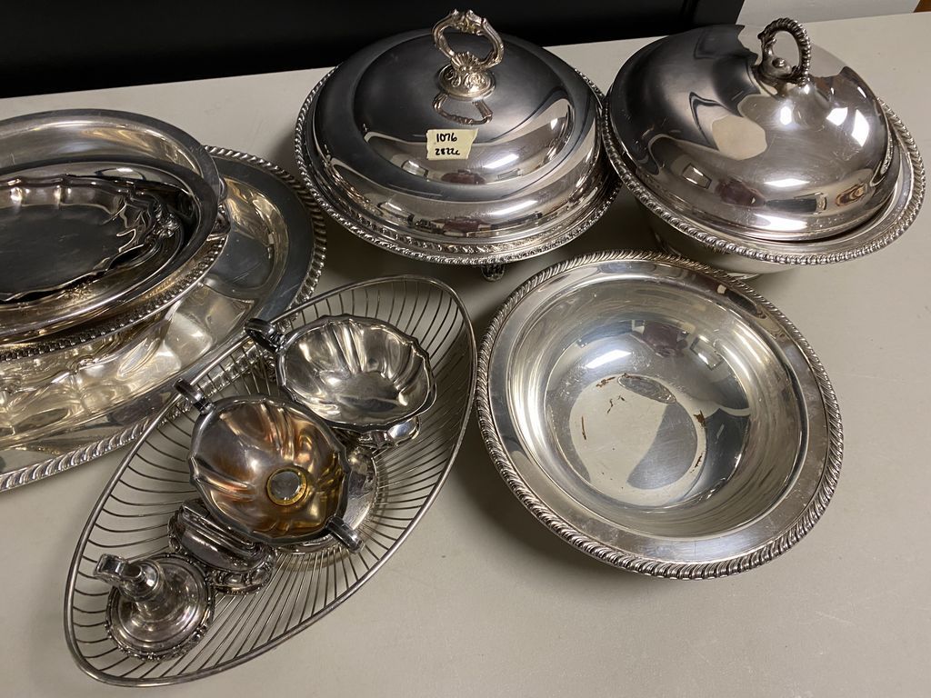 Group of Silver Plate Serving Pieces, platters, trays, covered bowls, wire basket, lighters, sugar and creamer, Location Back Office Group of Silver Plate Serving Pieces, platters, trays, covered bowls, wire basket, lighters, sugar and creamer, Location Back Office