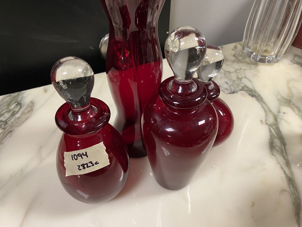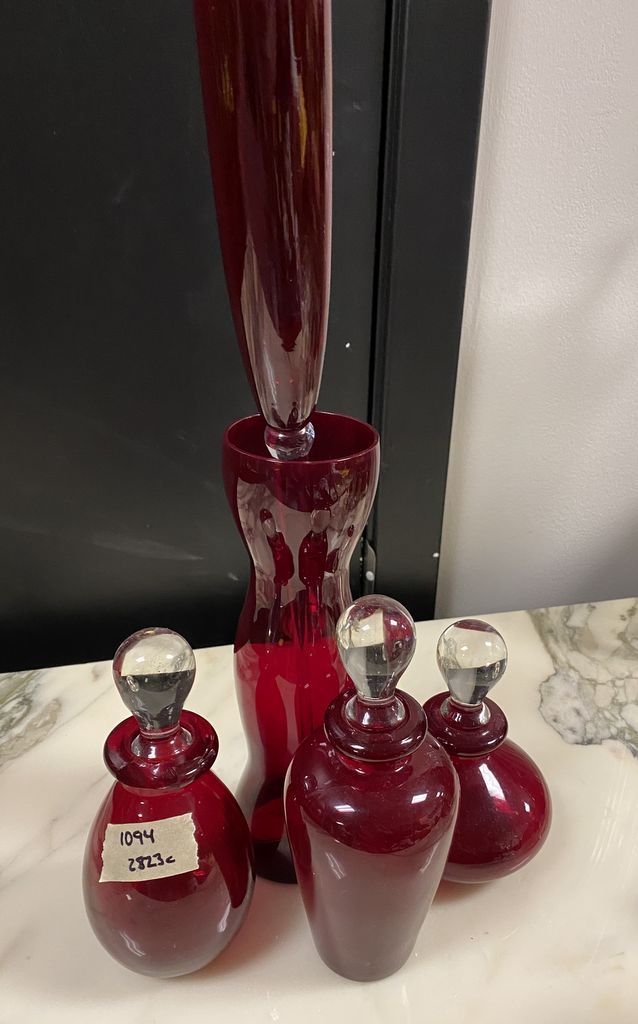 Red Glass decorative vases with stoppers, and art glass vase 10"h. Location Room by Kitchen Red Glass decorative vases with stoppers, and art glass vase 10"h. Location Room by Kitchen