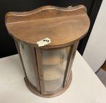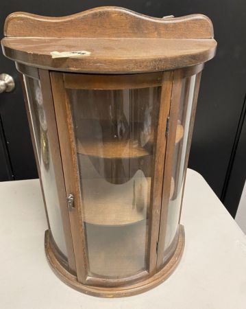 Small Wood Trinket Curio, two shelve, curved glass, 20"h. ,13"w. Location Back Bookcases Small Wood Trinket Curio, two shelve, curved glass, 20"h. ,13"w. Location Back Bookcases