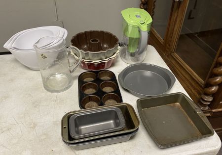 Group lot of kitchen items, pitcher, mixing bowls, pans, glass pitcher, Location Back Office Group lot of kitchen items, pitcher, mixing bowls, pans, glass pitcher, Location Back Office