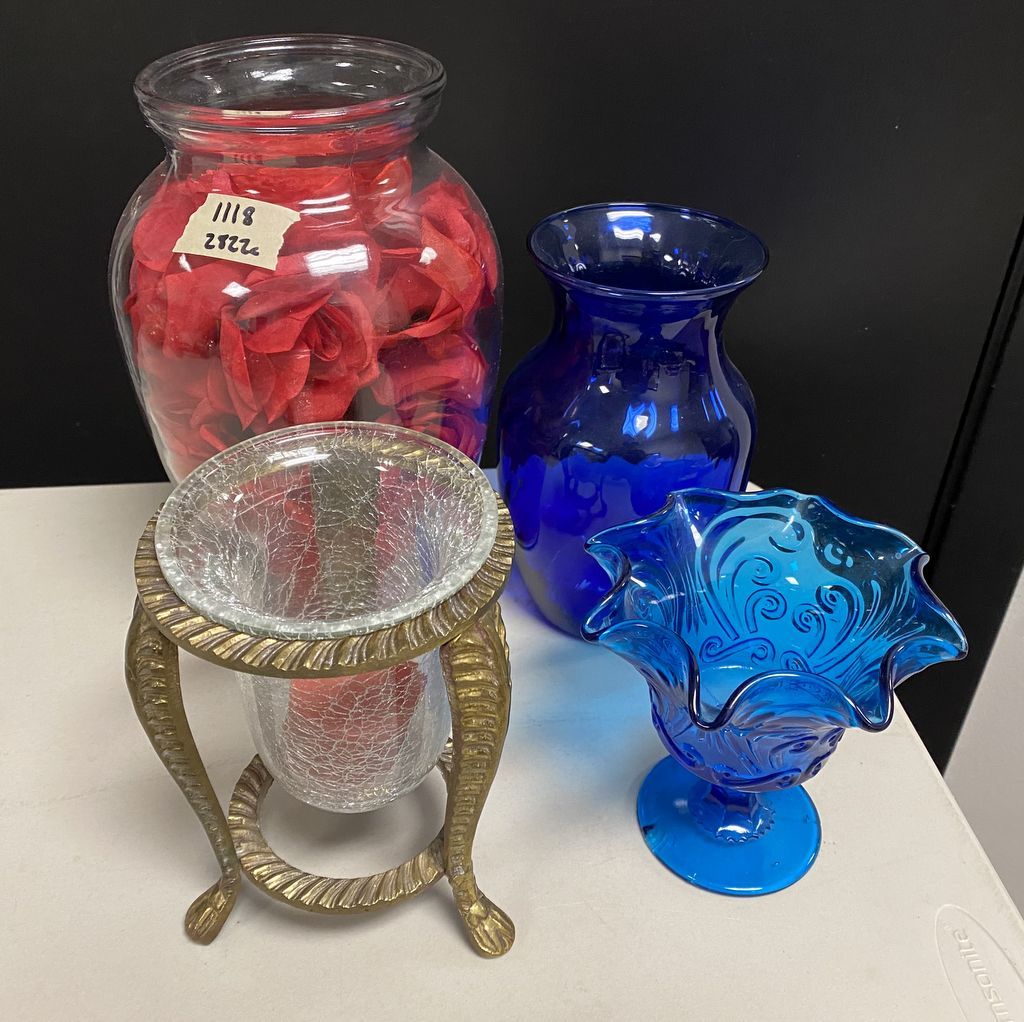 Glass Vases, Compote, and Candle Holder, blue vase, compote, clear glass vases. Location Back Bookcase Glass Vases, Compote, and Candle Holder, blue vase, compote, clear glass vases. Location Back Bookcase