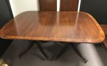 Banded Double Pedestal Dinning Table, two leaves, brass wheels, has some veneer on sides, top has some minor scratches and swirls, 30"h., 65"., 48"w. Banded Double Pedestal Dinning Table, two leaves, brass wheels, has some veneer on sides, top has some minor scratches and swirls, 30"h., 65"., 48"w.