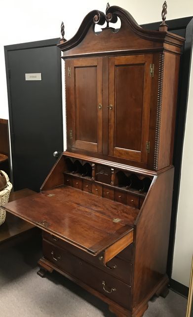 Chippendale Style Secretary Bookcase, antique reproduction, well made, double door, drop front desk with storage drawers, four bottom drawers, finials and crest, Mahogany, has key, 84"h., 38"w., 20"w. Chippendale Style Secretary Bookcase, antique reproduction, well made, double door, drop front desk with storage drawers, four bottom drawers, finials and crest, Mahogany, has key, 84"h., 38"w., 20"w.