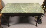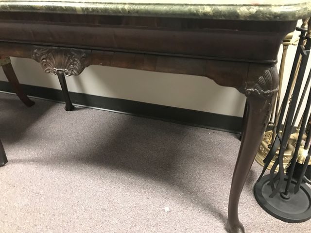 Antique Mahogany Mable Top Library Table , carved crests, age crackling veneer, marble good condition, 29"h., 48"w., 25"d. Antique Mahogany Mable Top Library Table , carved crests, age crackling veneer, marble good condition, 29"h., 48"w., 25"d.