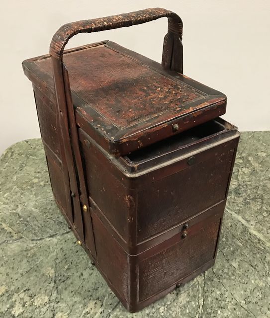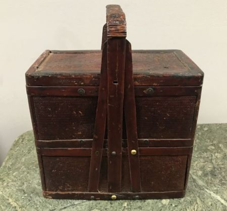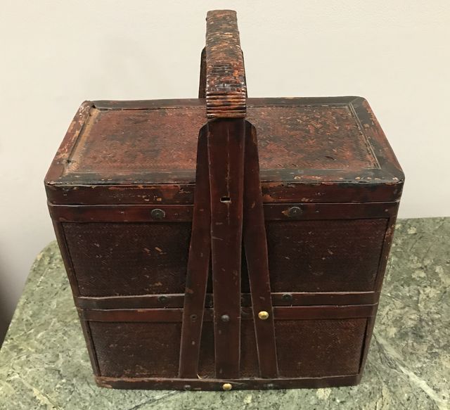Antique handled case, age wear, double stack storage box, woven, 17"h., 14"w. Antique handled case, age wear, double stack storage box, woven, 17"h., 14"w.