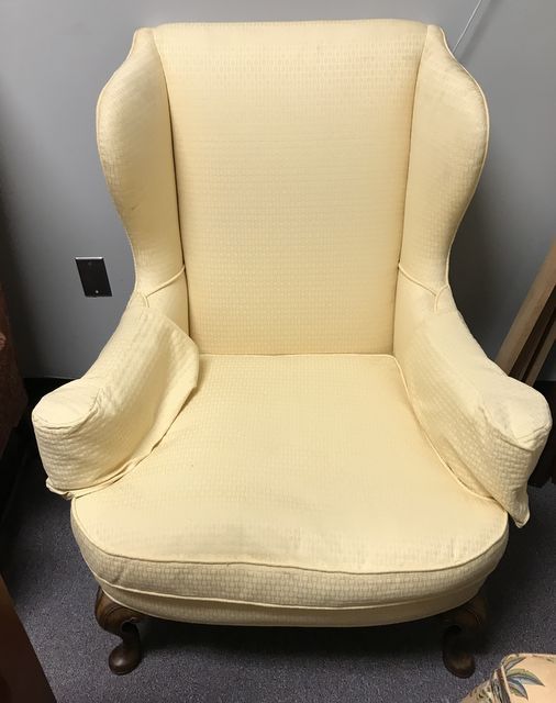 Wing Back Upholstered Arm Chair, Queen Anne, Good Condition, 41"h. Wing Back Upholstered Arm Chair, Queen Anne, Good Condition, 41"h.