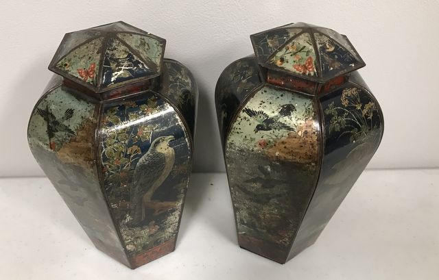 Pair Oriental Style Tin Vases, have wear, 11"h. Pair Oriental Style Tin Vases, have wear, 11"h.