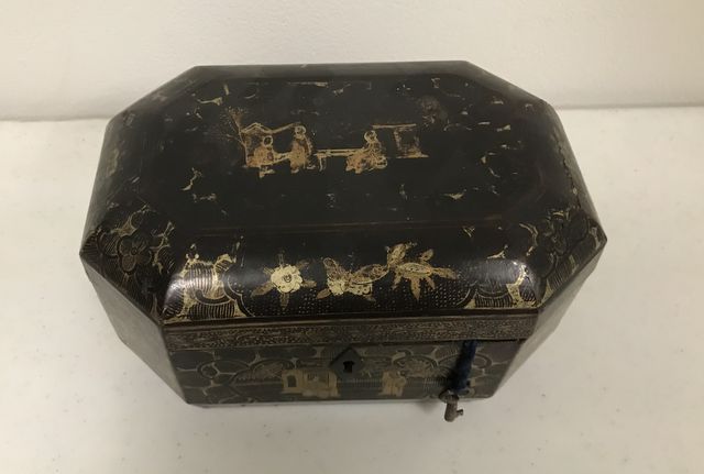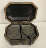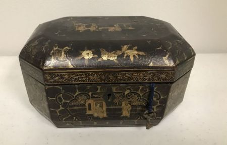 Vintage Oriental Style Tea Caddie, with metal containers inside, 4"h., 8"w. Vintage Oriental Style Tea Caddie, with metal containers inside, 4"h., 8"w.