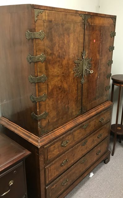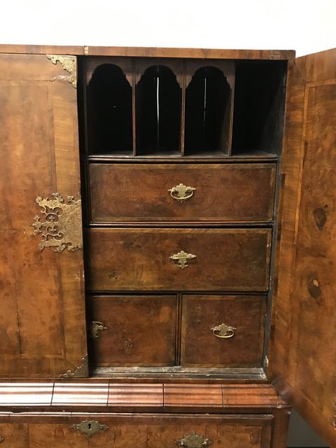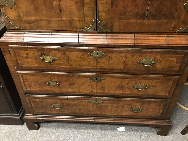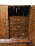 Mid 1800's Chippendale Style Two Piece Cabinet, three drawer, inner drawers and letter storage, has veneer age damage, buckling, needs work, 65"h., 38"w., 19"d. Mid 1800's Chippendale Style Two Piece Cabinet, three drawer, inner drawers and letter storage, has veneer age damage, buckling, needs work, 65"h., 38"w., 19"d.