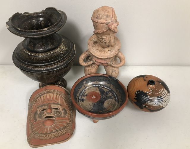 Group of Tribal and Mexico Pottery Pieces, hand painted Mexico footed bowl, mask, signed small vase, large terra cotta vase, and pottery figurine. Group of Tribal and Mexico Pottery Pieces, hand painted Mexico footed bowl, mask, signed small vase, large terra cotta vase, and pottery figurine.