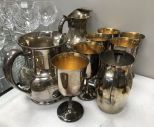 Silver plated pitchers, goblets (are monogrammed), and small pitcher. One pitcher is Pilgrim pewter. Silver plated pitchers, goblets (are monogrammed), and small pitcher. One pitcher is Pilgrim pewter.