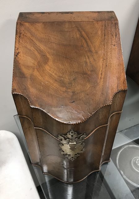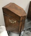 Georgian Style Burl Finish Letter Box , lift top, ornate metal latch, handled, veneer, inlaid border trim, 14"h., 11"d., 9"w. Georgian Style Burl Finish Letter Box , lift top, ornate metal latch, handled, veneer, inlaid border trim, 14"h., 11"d., 9"w.