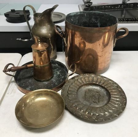 Vintage Copper and Brass Pieces, brass handled bucket 10"h., vase, pitcher, ornate plate. Vintage Copper and Brass Pieces, brass handled bucket 10"h., vase, pitcher, ornate plate.
