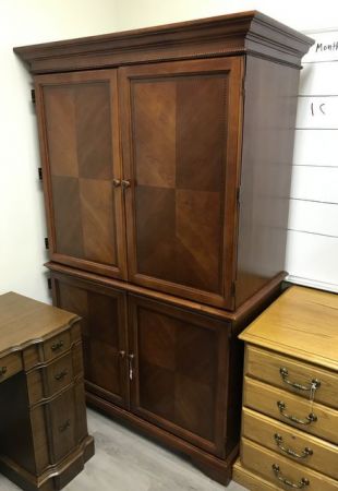 Modern Entertainment Center, inlaid trim work, double doors, good condition, 76"h., 44"w., 23"d Modern Entertainment Center, inlaid trim work, double doors, good condition, 76"h., 44"w., 23"d