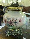 Hand Painted Floral Glass Lamp, glass vase, ornate brass base, with shade, 28"h. Hand Painted Floral Glass Lamp, glass vase, ornate brass base, with shade, 28"h.