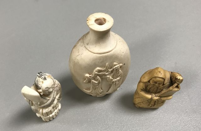 Small Oriental Carved Bone Figurines 2" and Snuff Bottle 3 1/2"h. Small Oriental Carved Bone Figurines 2" and Snuff Bottle 3 1/2"h.