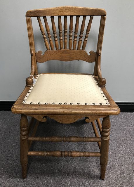 Vintage Oak Spindle Back Side Chair, carved trim, fabric seat cushion, 32"h. Vintage Oak Spindle Back Side Chair, carved trim, fabric seat cushion, 32"h.